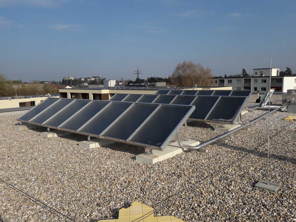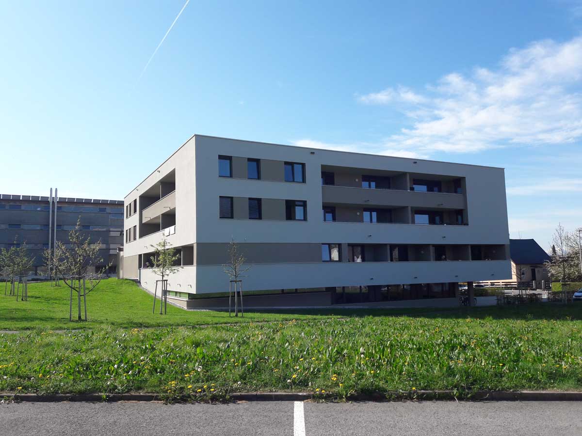 3 Baukörper mit 53 Wohnungen, Forschungsprojekt Energieinstitut, Kontrollierte Be- und Entlüftung, Wohnungsstationen für FBH + WW-Erzeugung, Trinkwasserenthärtung, Dauerhafte Messung von Temperatur / CO2 / Rel. Feuchte je Wohnung
