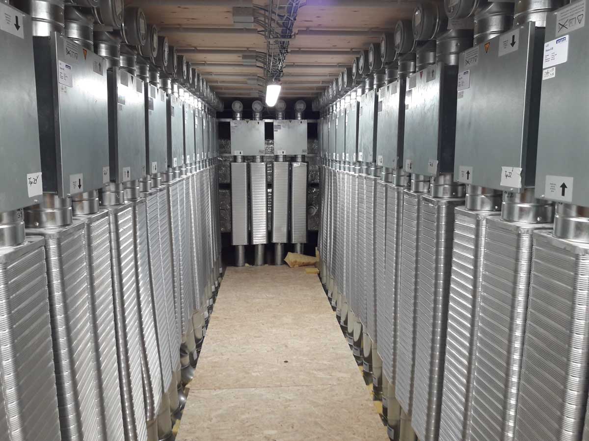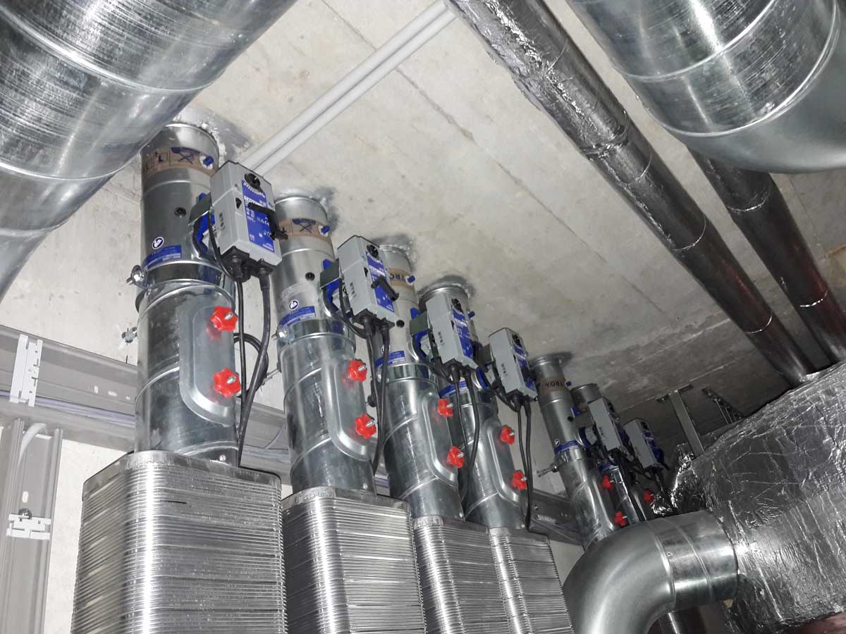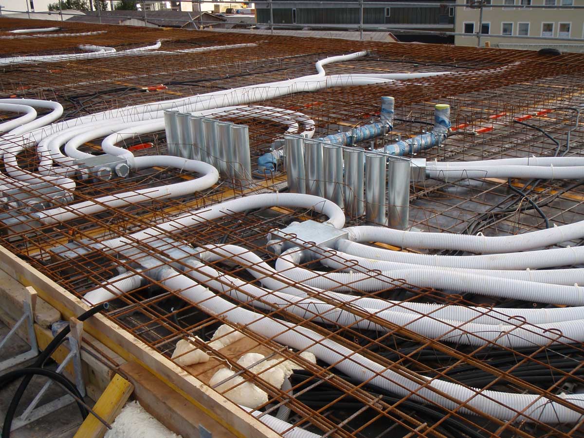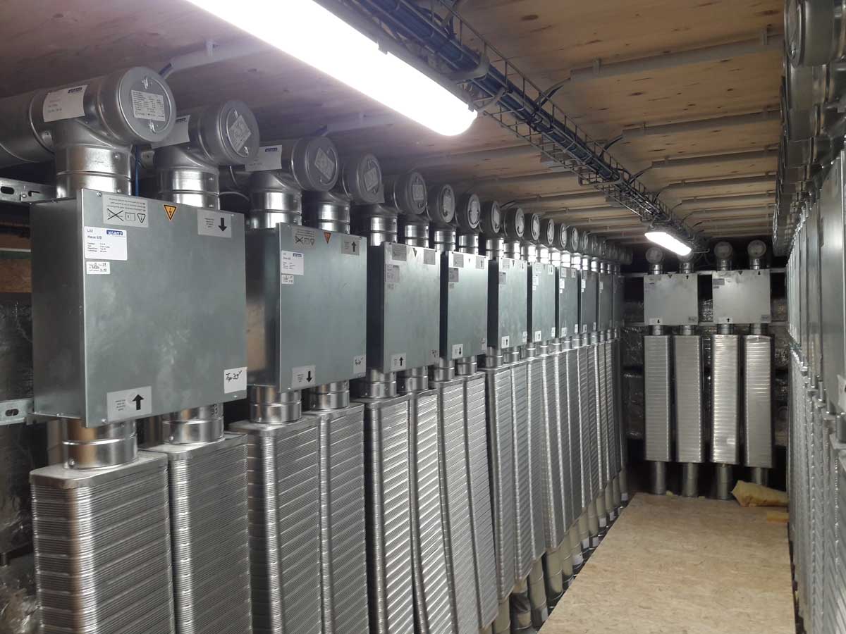 3 Baukörper mit 63 Wohnungen, Kontrollierte Be- und Entlüftung, Grundwasser-Wärmepumpen für FBH + WW-Erzeugung, Dachbox je Haus als Lüftungszentrale am Dach für komplette Lüftungstechnik inkl. Wohnungs-v-Boxen, Trinkwasserenthärtung