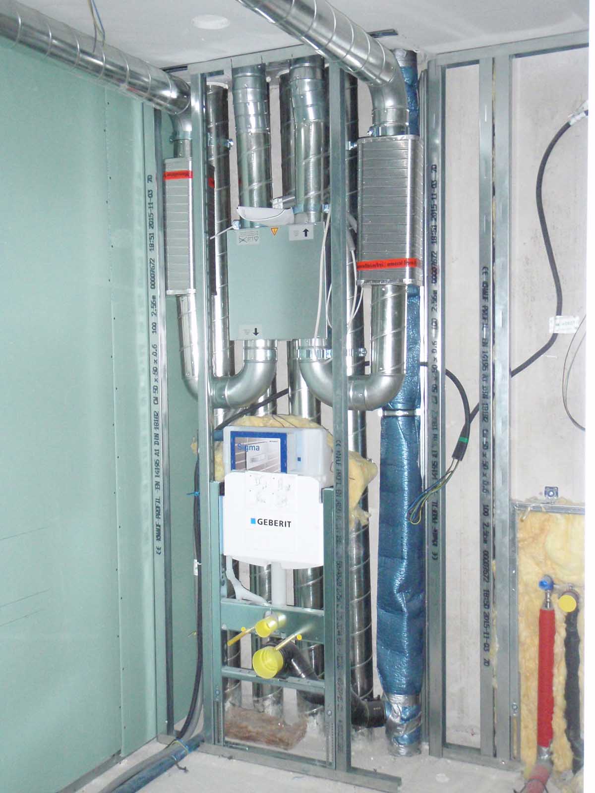 Energieeffizienz im Bestand Faktor 8, Umbau Bestandsgebäude auf Niedrigstenergiestandard, Kontrollierte Be- und Entlüftung mit dezentralen Einzelgeräten mit hocheffizienter WRG, Fernwärme für FBH, HK + WW-Erzeugung, Trinkwasserenthärtung, Förderungsabwicklung über KPC